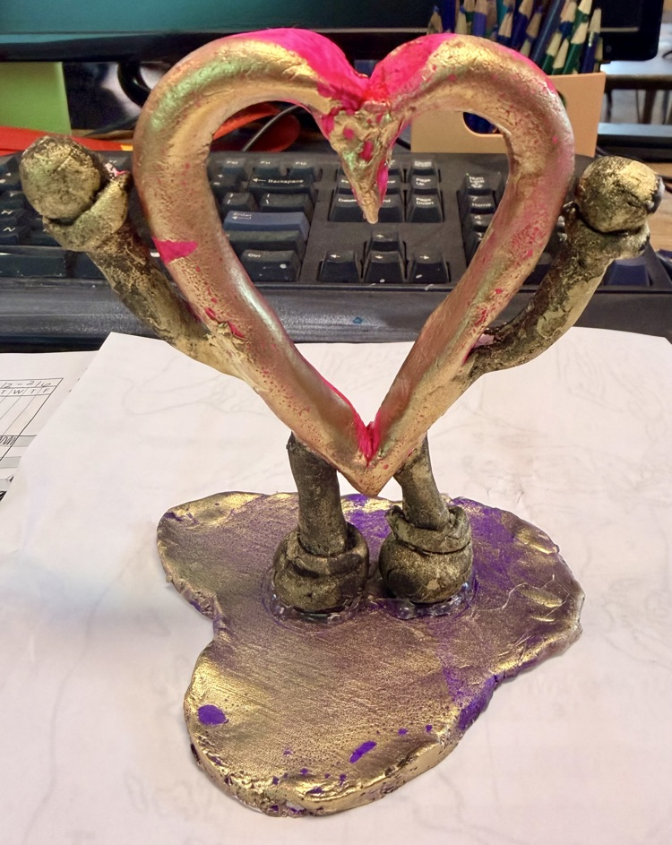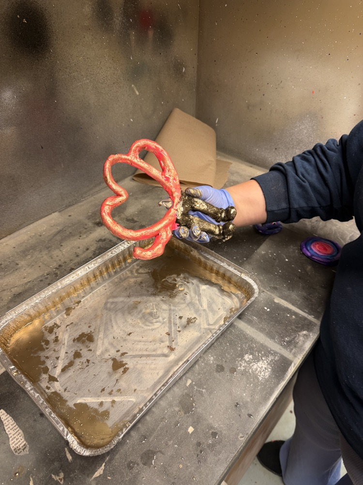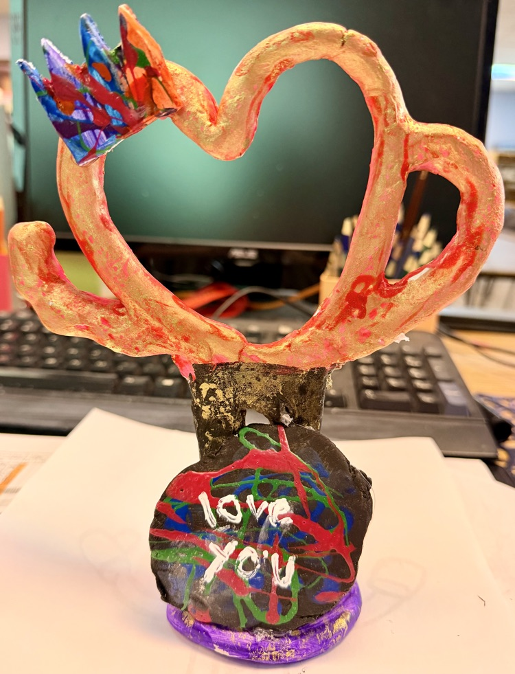 6th Grade Art wrapped up their Jason Naylor inspired heart clay sculptures just in time for Valentine’s Day, showcasing their incredible creativity and teamwork! Students learned about this renowned graffiti artist and his powerful message of creating an open heart, understanding that love comes in many forms and that together, we can overcome any obstacle. ❤️ Students crafted their sculptures using air dry clay, scoring and slipping the pieces together to form a single, unified piece, with some requiring hot glue for added stability. Then, they brought their creations to life with vibrant neon paint, emulating Naylor's signature style through intricate patterns. Finally, they mastered the technique of hydro-dipping, infusing their sculptures with a dazzling golden sparkle.
